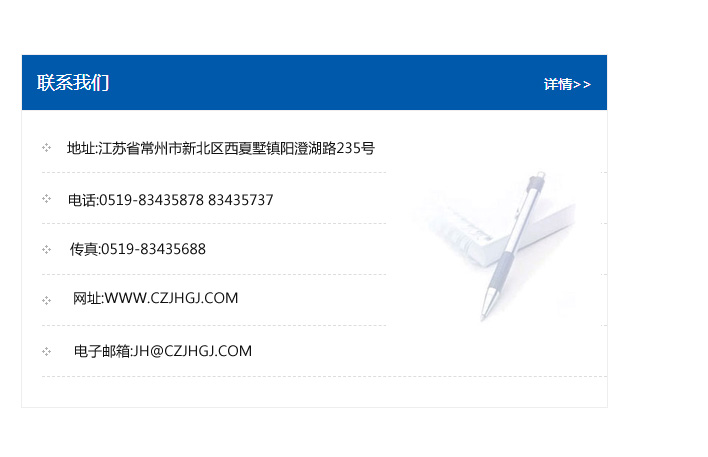 地址:常州市新北區友邦商務大廈1幢16、17層  電話:0519-85101652  傳真:0519-85112595  郵編:213022  網址:www.cz-jiayue_cn.cqxdlx.com  郵箱:xiajifengaa@163.com